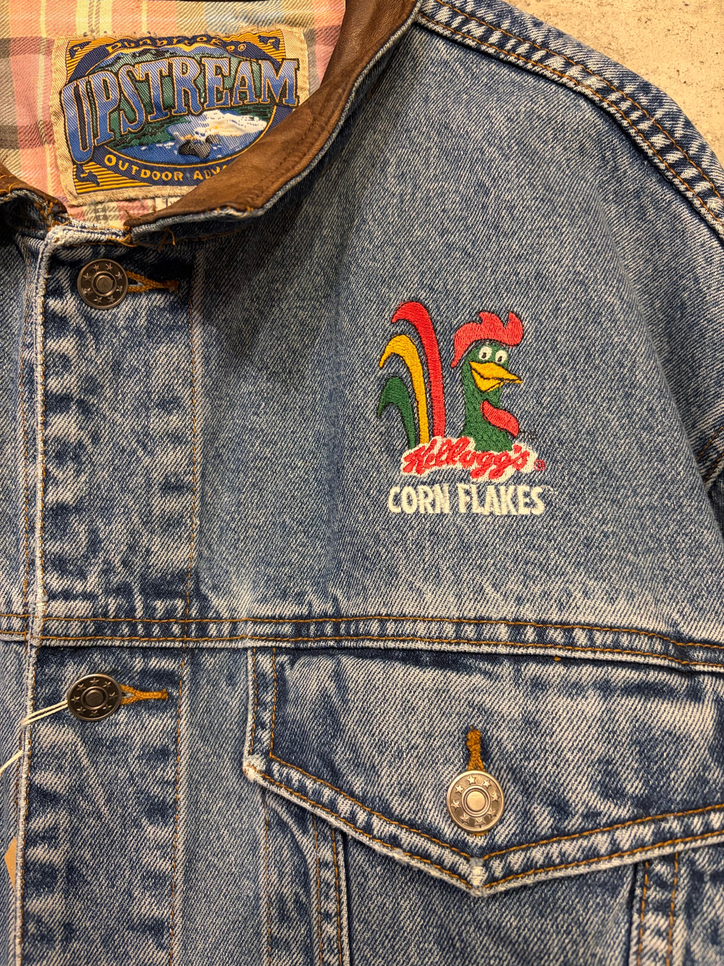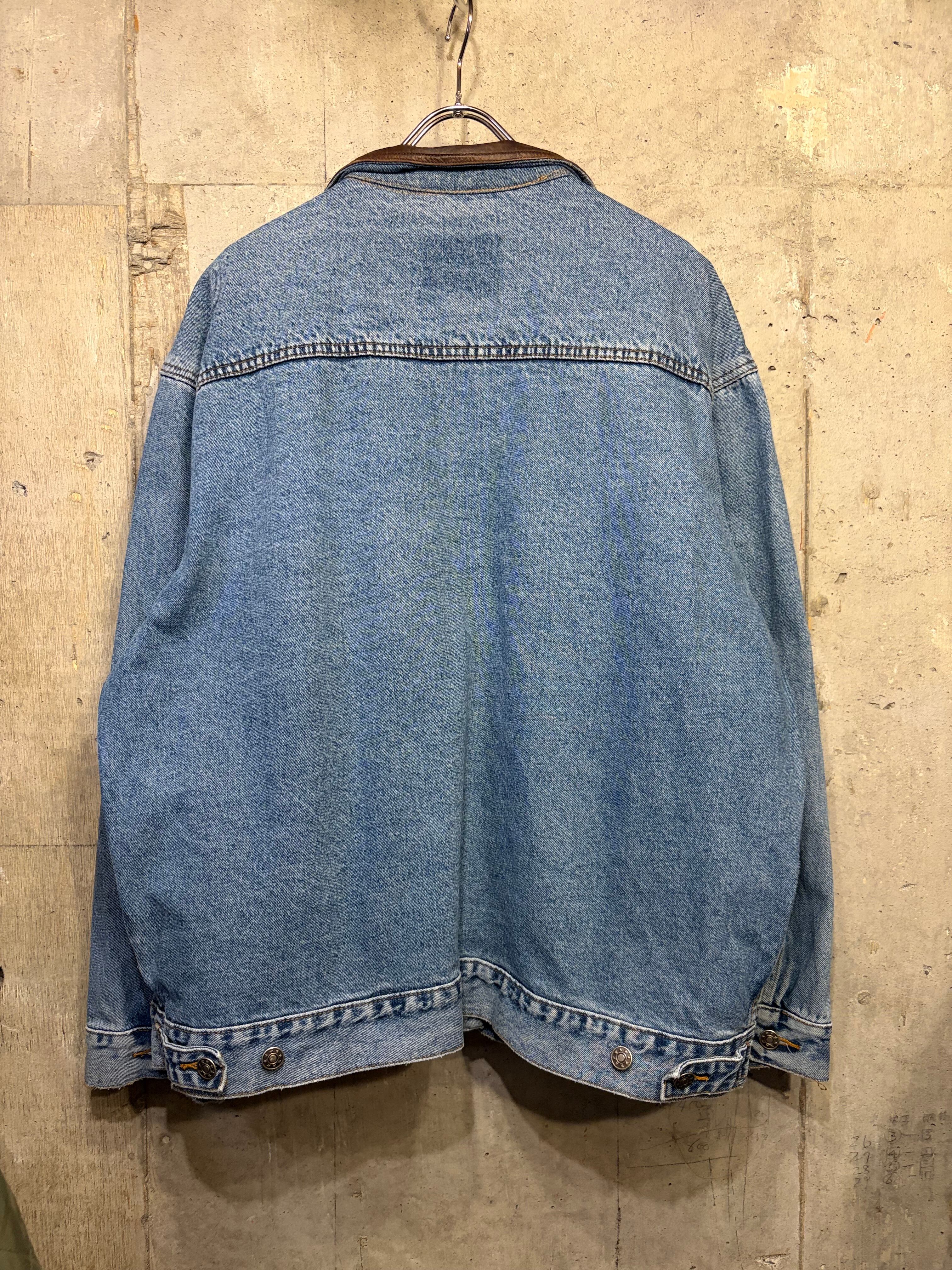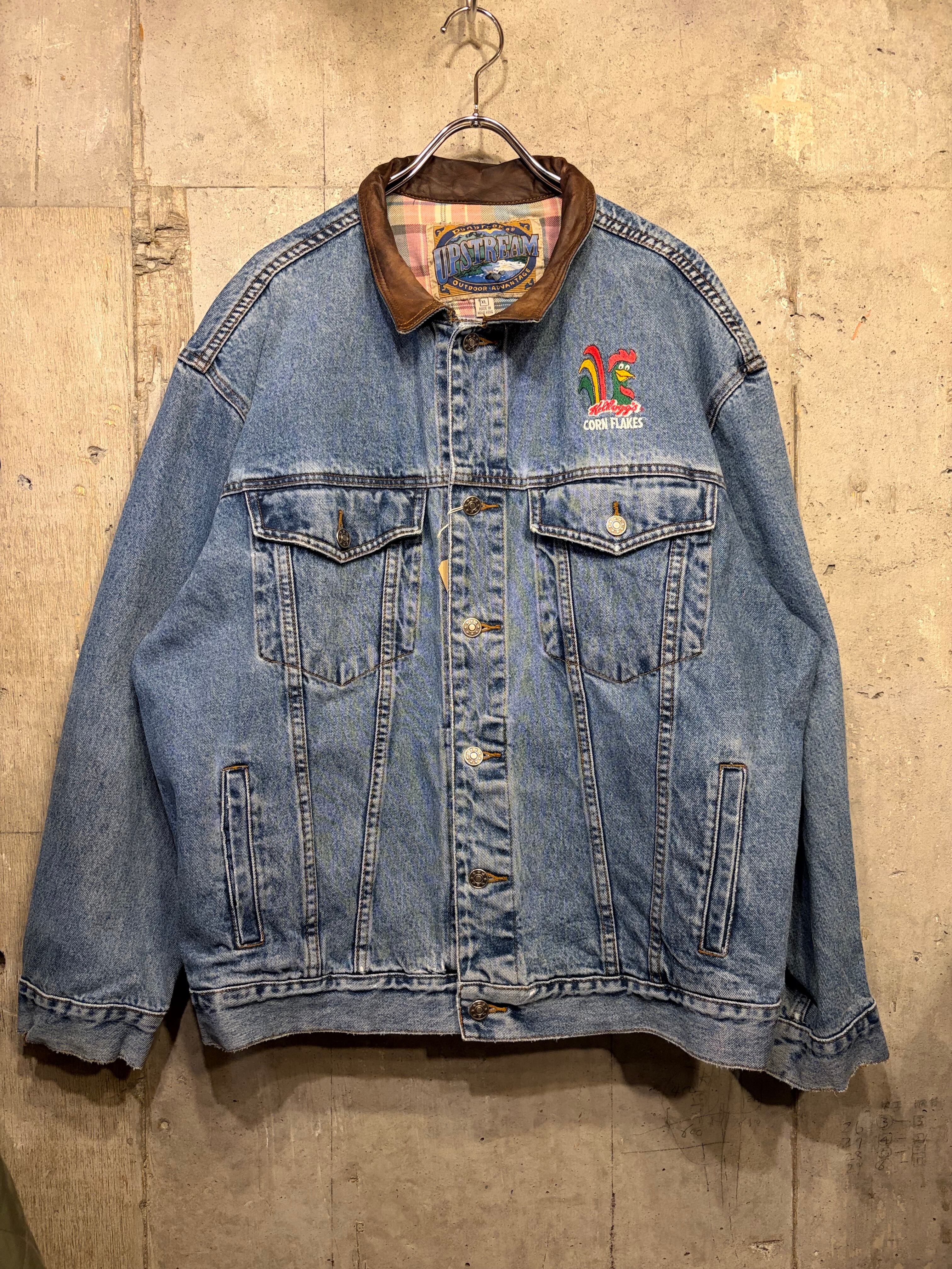 【XL相当】デニムジャケット 襟レザー 企業ロゴ コーンフレーク