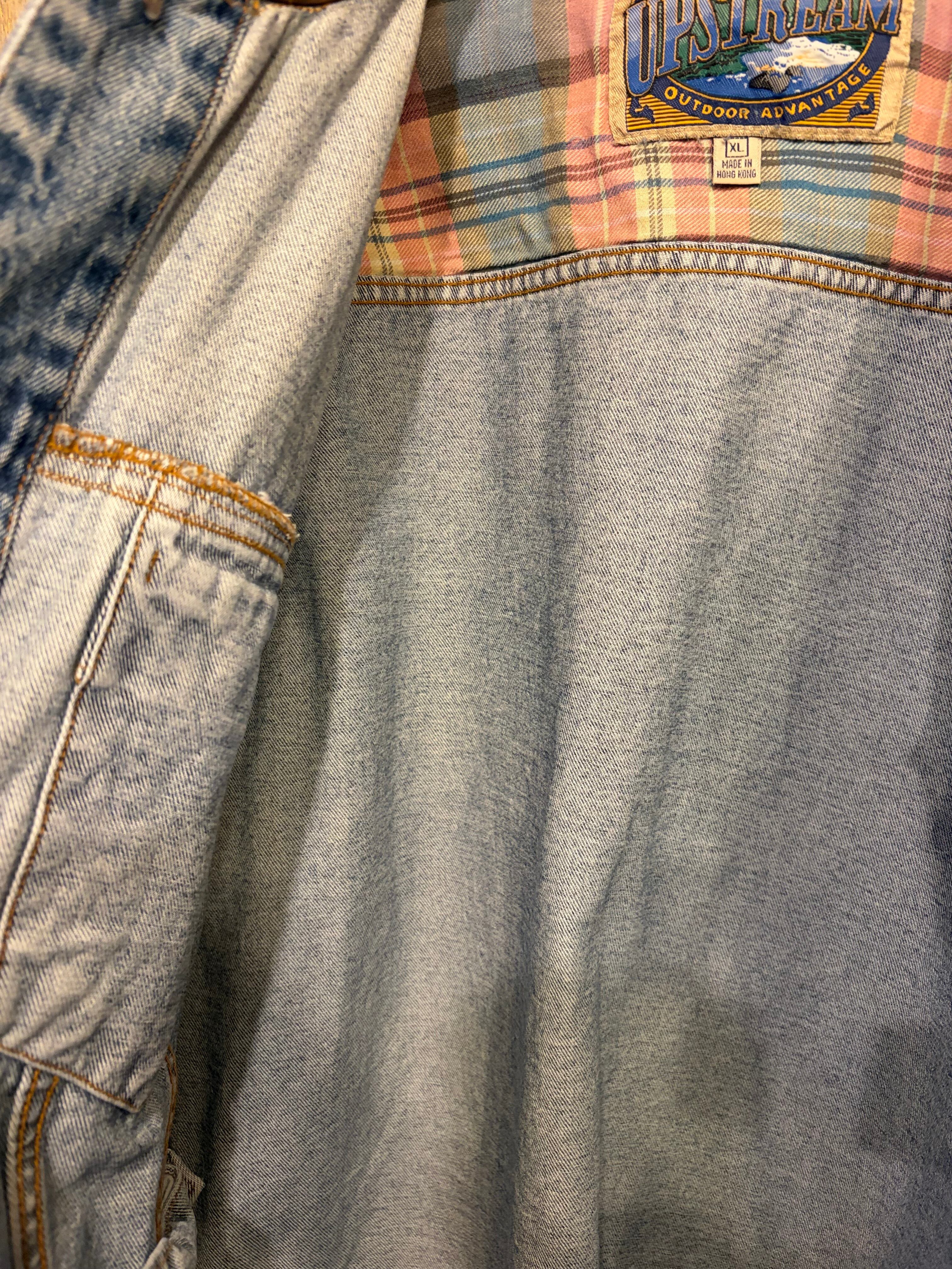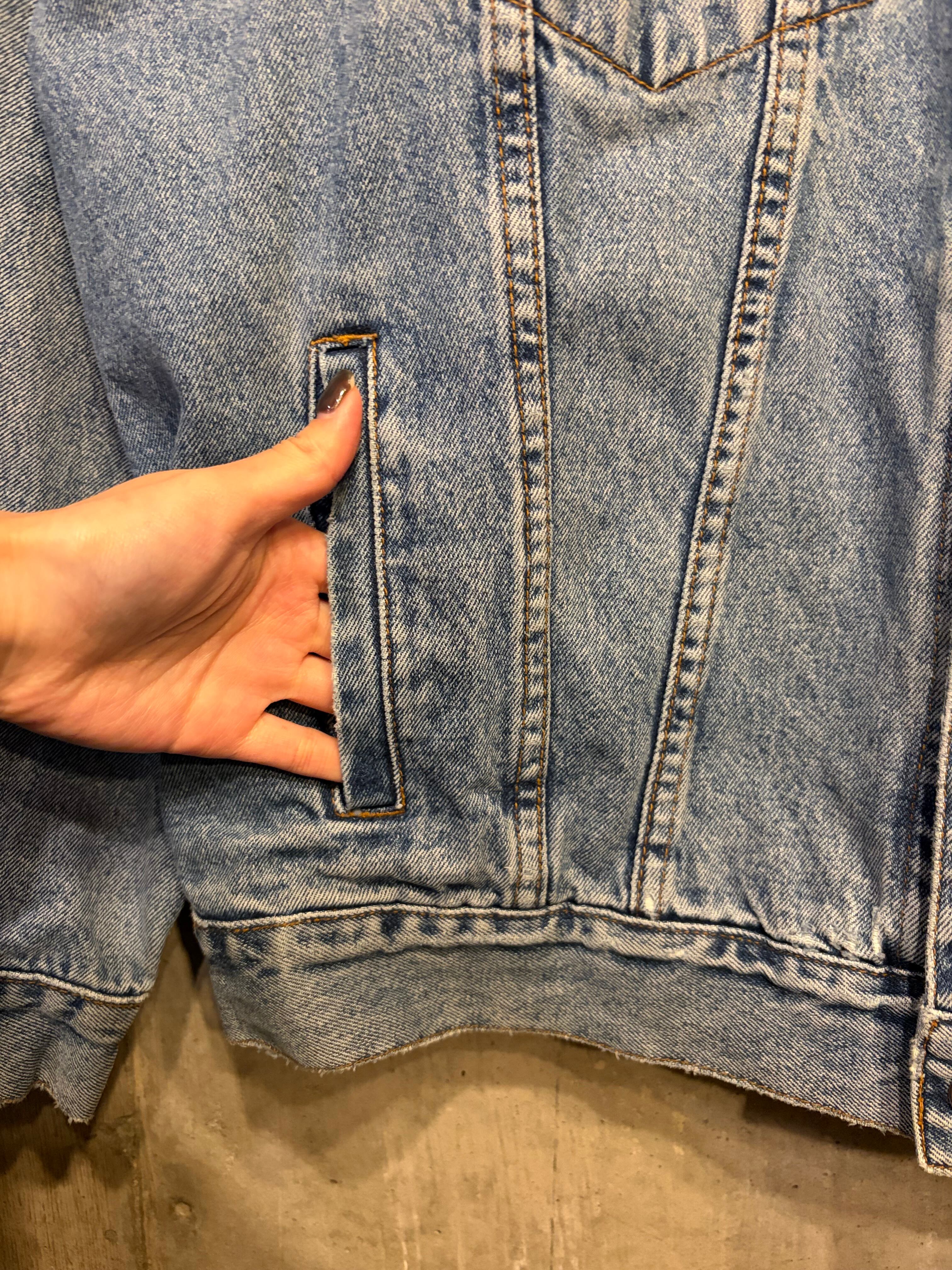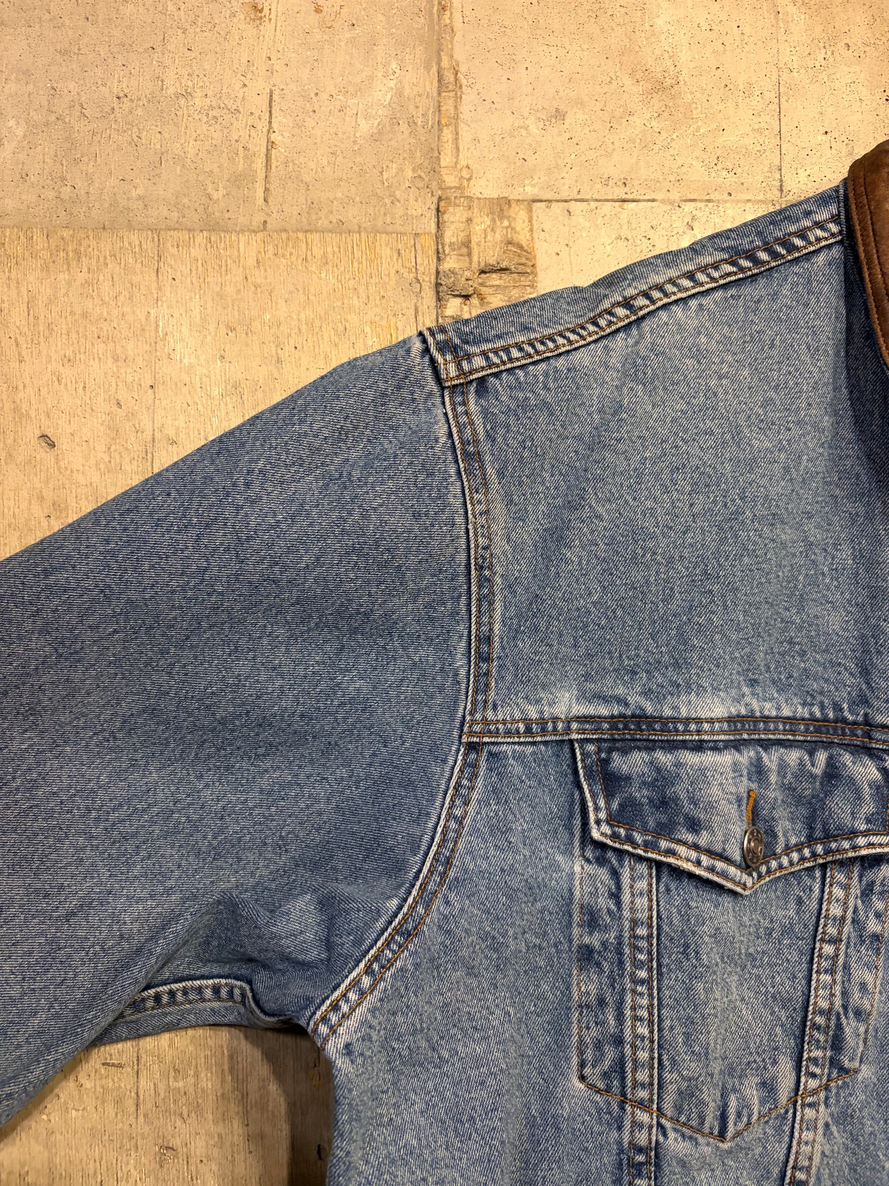【XL相当】デニムジャケット 襟レザー 企業ロゴ コーンフレーク